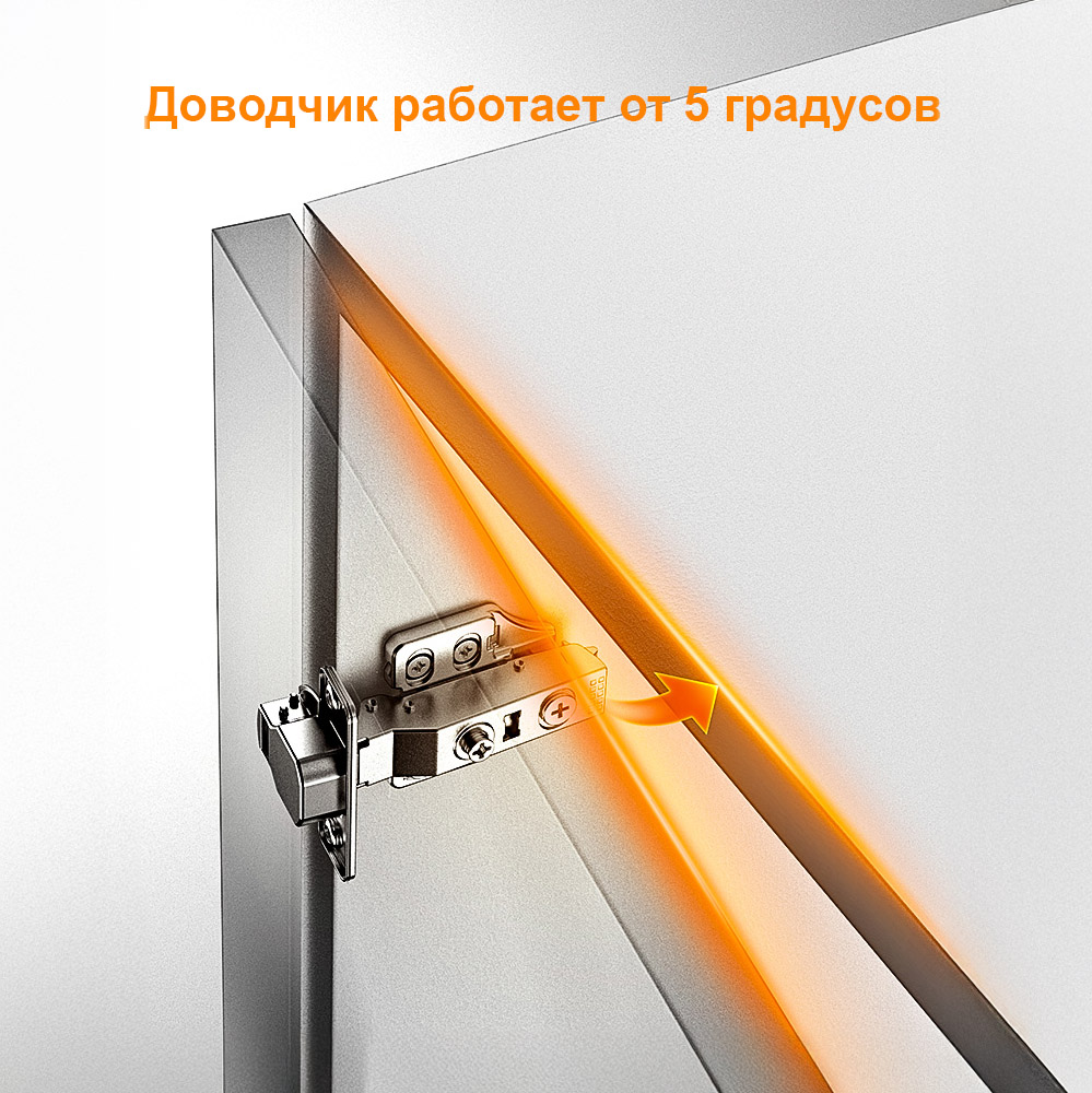 - Работа доводчика начинается с 5 градусов. Доводчик начинает смягчать движение двери уже с угла в 5 градусов, что гарантирует контролируемое закрывание и предотвращает резкие движения.