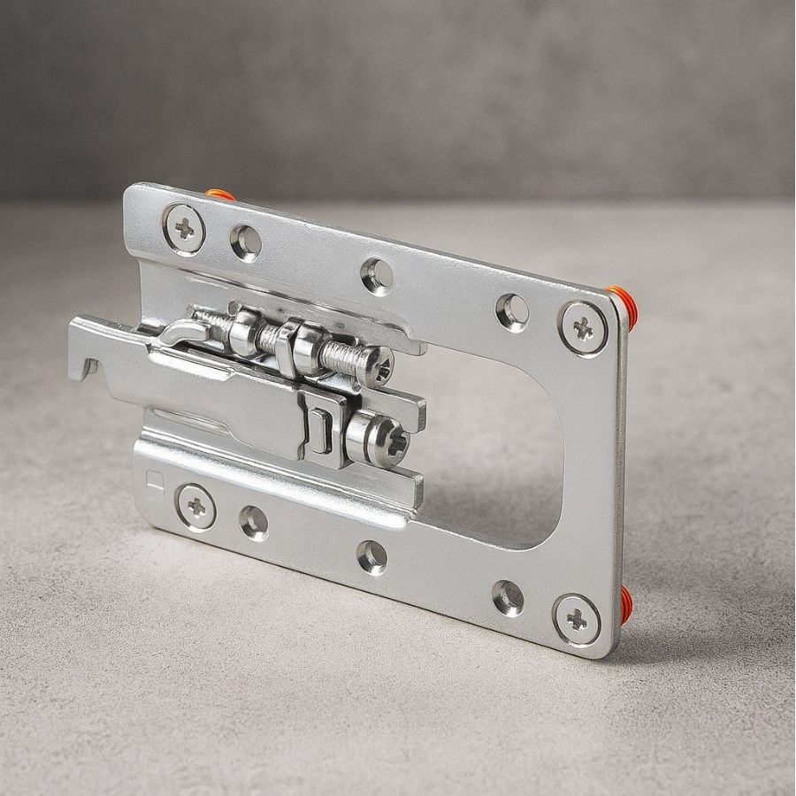 Подвеска каркаса от известного итальянского производителя 807 XL RV применяется для нижних шкафов весом до 100 килограмм. Модификация XL еще более массивная и надежная. Этот мебельный навес открывает творческий простор для дизайнеров интерьера. Мебель, висящая на таких подвесах не требует декоративных опор, и как бы парит в воздухе. Так же важной особенностью этой модификации подвески является то, что она устанавливается под фрезеровку, за под лицо с внутренней стенкой корпуса, что позволяет использовать ее с направляющими скрытого типа. Подвески каркаса 807 XL RV абсолютно безопасны в использовании и имеют запатентованную защиту от случайного падения шкафа. Демонтаж шкафа производится при помощи отвертки, которую надо упереть в защитную пружину, находящуюся в крепежной пластине.