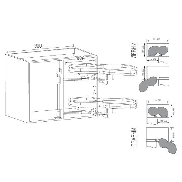 Каждая полка выдерживает нагрузку до 15 кг, что позволяет эффективно использовать пространство для хранения различных кухонных принадлежностей.
