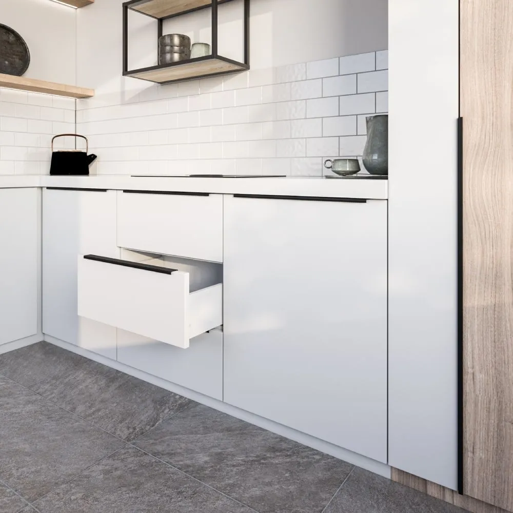 - Широкий размерный ряд — от 50 до 1000 мм: Возможность подбора под любой тип мебели — от узких буфетных ящиков до широких шкафов-купе. Это позволяет создавать визуально сбалансированные композиции, где ручка становится естественным продолжением линии фасада, а не отдельным акцентом.