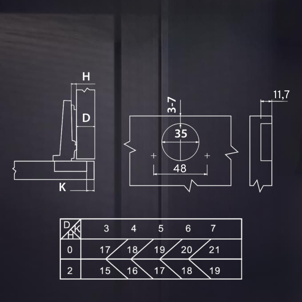 Доступны 3 вида расстояний между отверстиями в чашке петли: