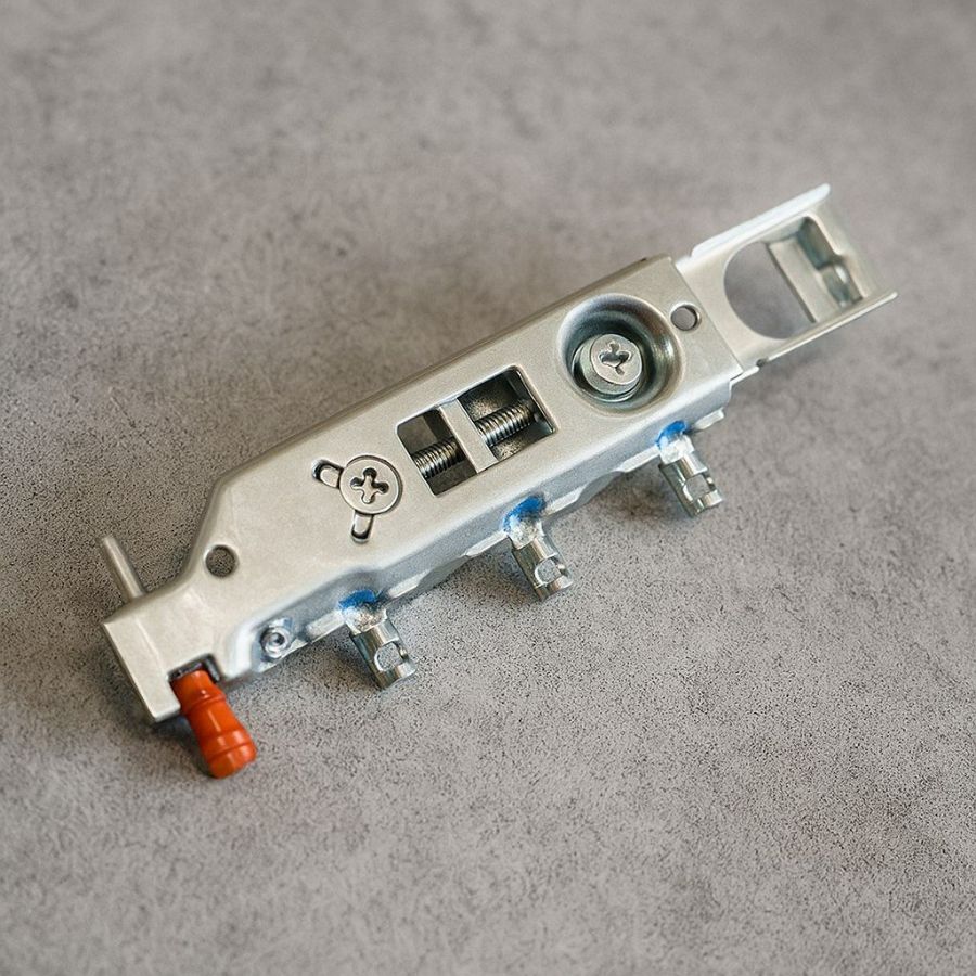 Подвески мебельные скрытые известного итальянского производителя 818 монтируются в верхние кухонные модули за оргалитом или ДВП. Поэтому такие навесы и называются скрытыми. Видимой частью являются только круглые пластиковые заглушки, которые скрывают регулировочные винты. К слову, диапазон регулировки таких подвесок составляет 10 мм по глубине и целых 12 мм по высоте. Навесы 818 выполнены из стали, и выдерживают нагрузку до 65 кг.