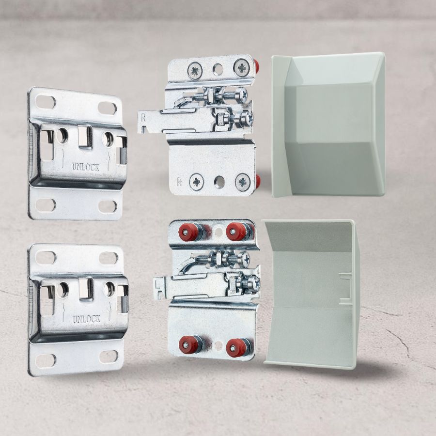 Подвески каркаса 807 абсолютно безопасны в использовании и имеют запатентованную защиту от случайного падения шкафа. Демонтаж шкафа производится при помощи отвертки, которую надо упереть в защитную пружину, находящуюся в крепежной пластине.