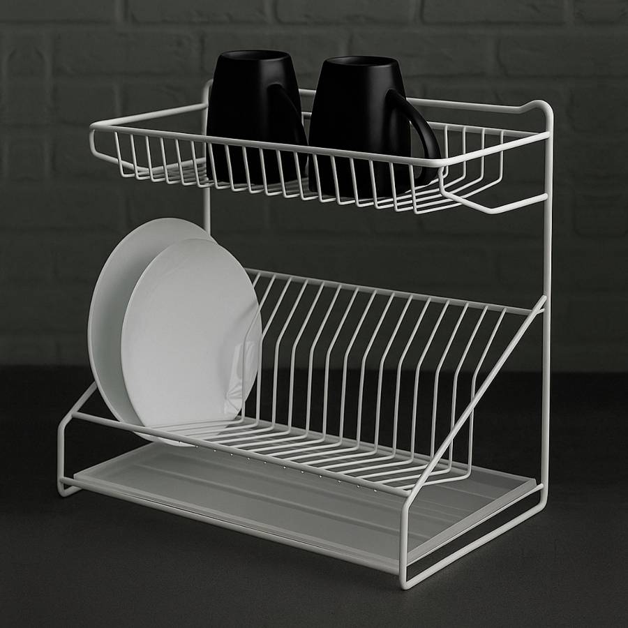 Двухъярусная сушилка для посуды с поддоном предназначена для быстрого и эффективного высыхания посуды после ее мытья. Она имеет два уровня, на которых можно разместить посуду, а также поддон, который собирает воду, стекающую с посуды во время сушки.