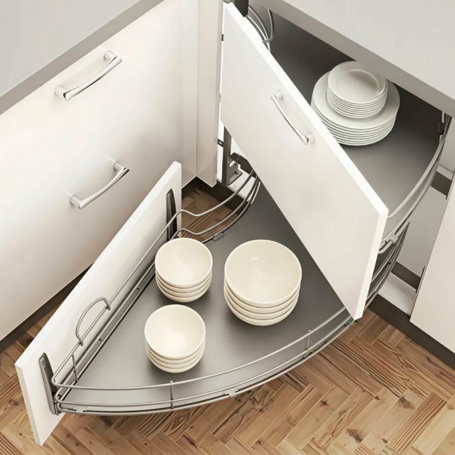 Угловой механизм TWISTER это пожалуй единственное на мебельном рынке решение, позволяющее разделить фасад волшебного уголка на два уровня. Благодаря этой особенности волшебный уголок TWISTER от итальянской компании Compagnucci идеально впишется в дизайн современной кухни. Покрытие полок этого уголка имеет специальное антискользящее покрытие. Сочетание хрома и белой ХДФ будет смотреться эффектно в Вашей мебели.