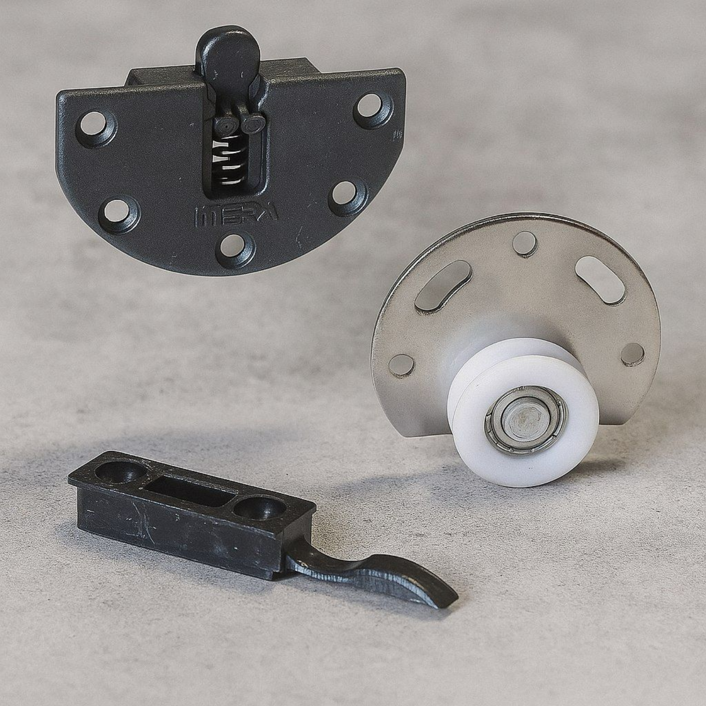 Простая система для шкафов купе MEPA SKM 30 оптимально подойдет для небольших прихожих эконом класса. Несмотря на свою доступную цену, нижние ролики снабжены подшипниками. Для установки данного комплекта фурнитуры Вам потребуется сверло Форстнера (фреза) диаметром 26 мм. Направляющие к данной системе также являются врезными.