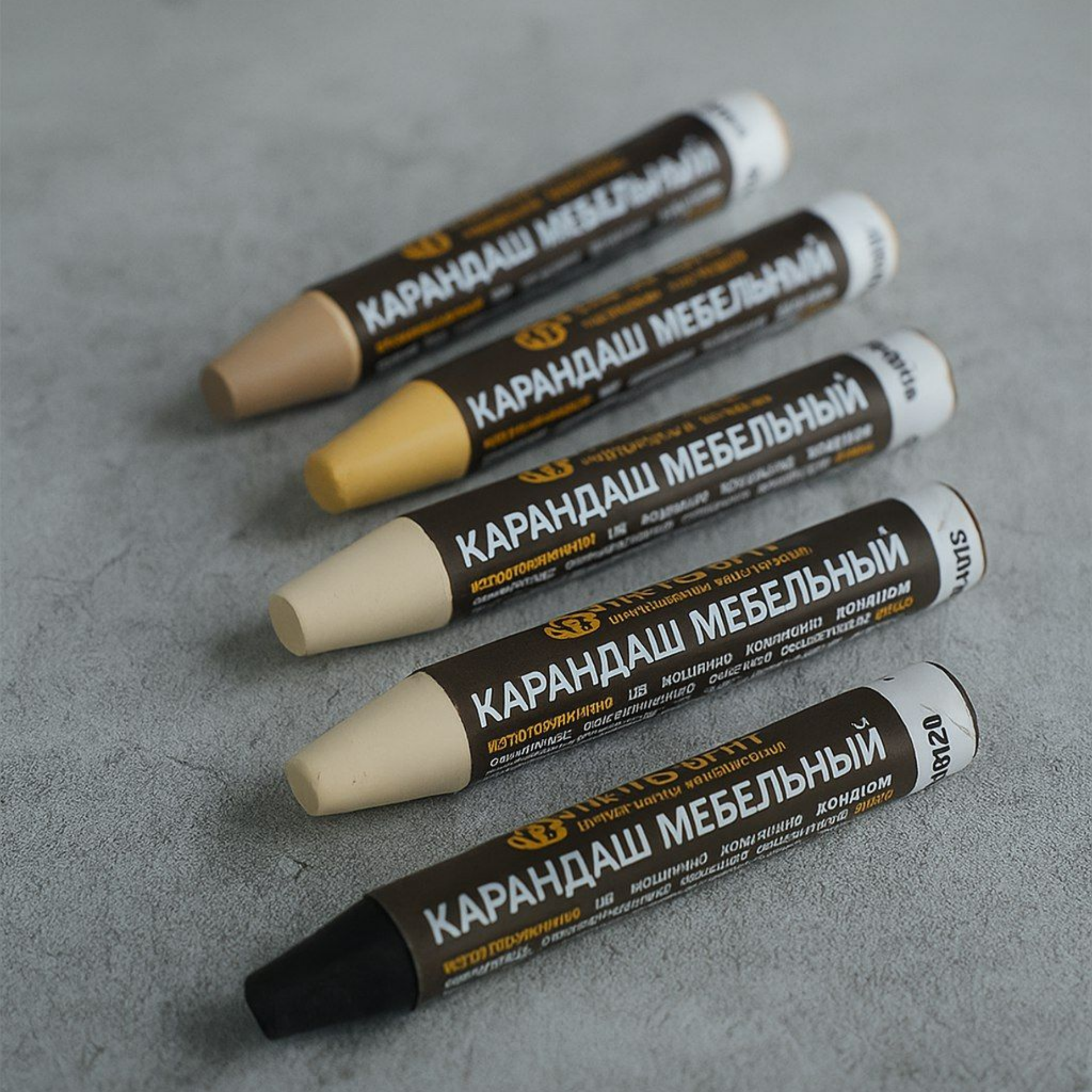 Карандаши представлены в широкой цветовой гамме — от светлого дуба до тёмного венге и чёрного. Подбирайте по принципу «на глаз»: если цвет совпадает с тоном мебели при дневном свете — значит, вы нашли идеальный вариант. Для сложных оттенков лучше взять два близких — один можно будет слегка смешать с другим пальцем.