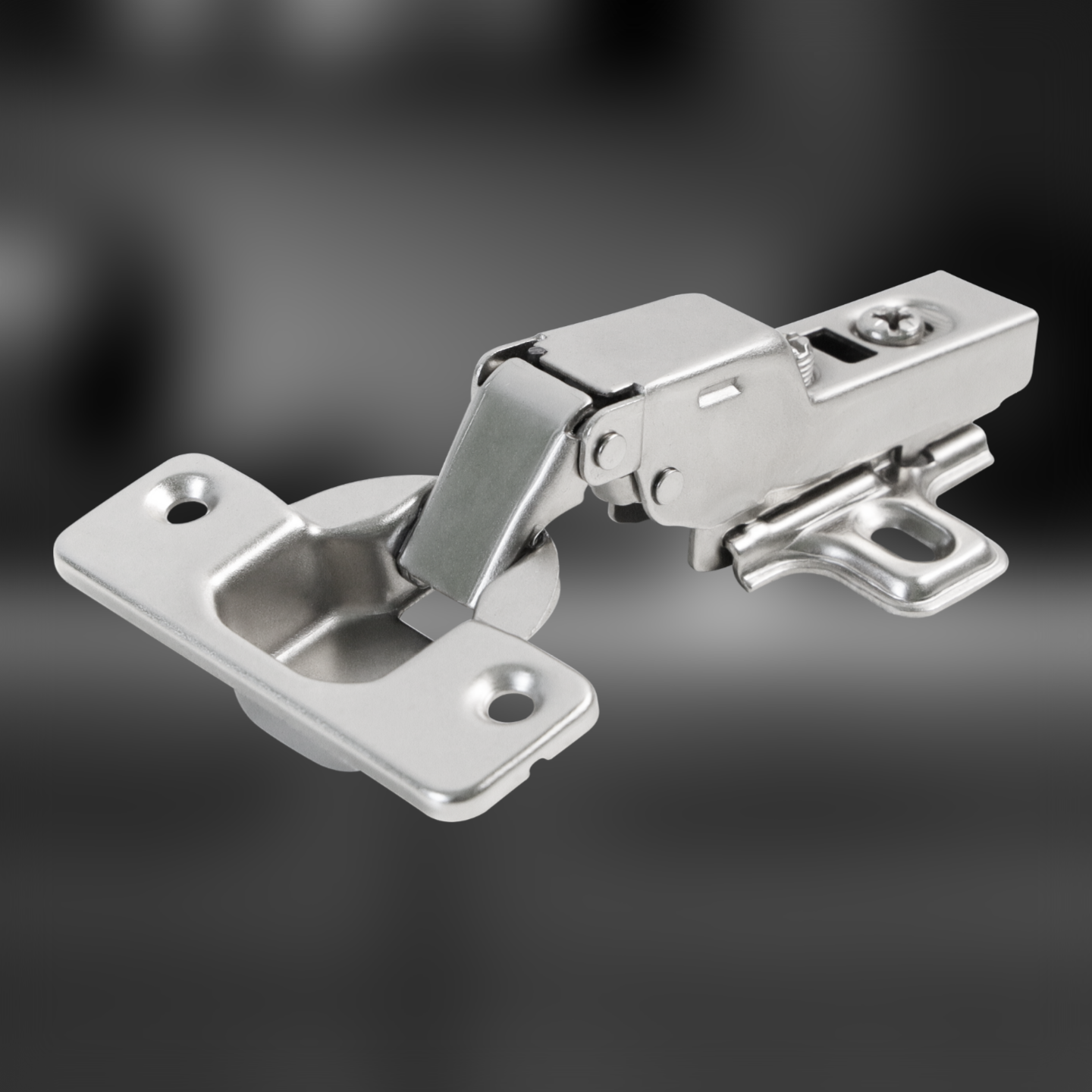 Полунакладная петля предназначена для использования в мебели, где используются смежные двери, где два фасада прикручены с двух сторон от перегородки шкафа. Петля закрывает пол торца ДСП, соединяя боковую стенку с фасадом под углом 90 градусов и обеспечивая угол открывания 95-110 градусов.