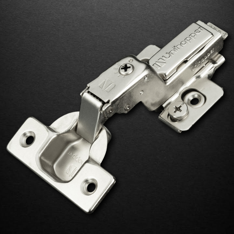 3D петля UNIHOPPER HUTTON с доводчиком, вкладная — это современное решение для установки дверей внутри корпуса, при котором торец боковой стенки виден полностью. Изогнутое плечо мебельной петли снижает сопротивление при открывании дверей. Основное преимущество вкладных петель заключается в их способности обеспечивать скрытое размещение дверей внутри мебельного корпуса.
