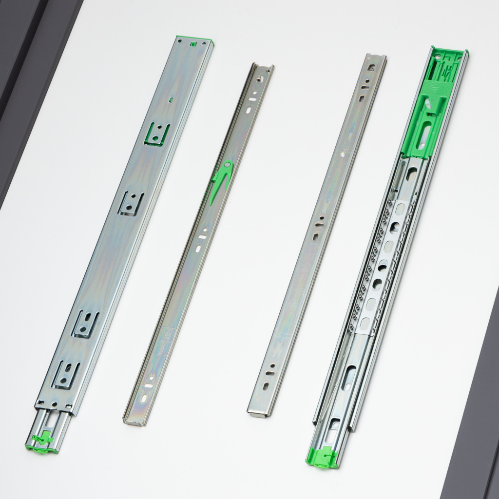Направляющие шариковые Push to open полного выдвижения 45 мм длиной 500 мм от итальянской компании FGV, изготовленные из стали толщиной 1.2 мм, представляют собой надежное и функциональное решение для мебельного производства. Рассчитанные на нагрузку до 35 кг, эти направляющие позволяют создавать элегантную мебель без ручек, где ящик открывается легким нажатием. Телескопический механизм обеспечивает полный доступ ко всему содержимому ящика, а плавный и бесшумный ход гарантирует комфортное использование. Направляющие Push to open FGV соответствуют высоким европейским стандартам качества, что подтверждается сертификатом, гарантирующим безотказную работу в течение 60 000 циклов открывания.