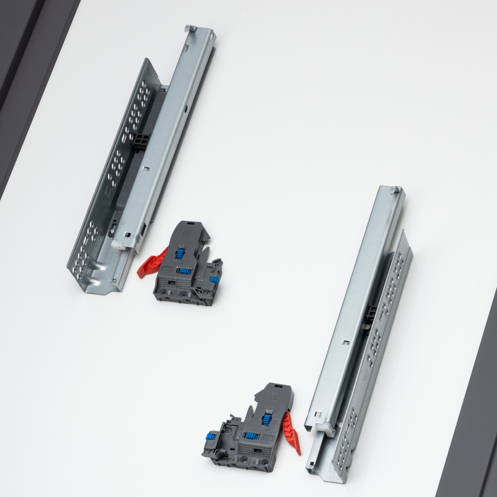 Направляющие скрытого монтажа полного выдвижения MF, обладающие квадратным сечением,Эти высококачественные направляющие, выполненные с квадратным сечением, обеспечивают исключительную жесткость и надежность, значительно превосходя традиционные шариковые направляющие. Благодаря этому, вы можете быть уверены, что каждый ящик будет выдвигаться плавно и без усилий, а все детали идеально подогнаны для достижения максимальной точности. Направляющие скрытого типа MF снабжены системой push to open, при помощи которой открывание происходит легким нажатием на фасад.