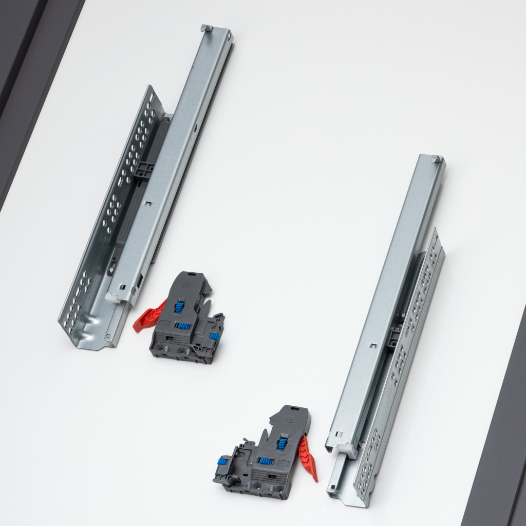 Направляющие скрытого монтажа полного выдвижения MF, обладающие квадратным сечением,Эти высококачественные направляющие, выполненные с квадратным сечением, обеспечивают исключительную жесткость и надежность, значительно превосходя традиционные шариковые направляющие. Благодаря этому, вы можете быть уверены, что каждый ящик будет выдвигаться плавно и без усилий, а все детали идеально подогнаны для достижения максимальной точности. Направляющие скрытого типа MF снабжены системой push to open, при помощи которой открывание происходит легким нажатием на фасад.