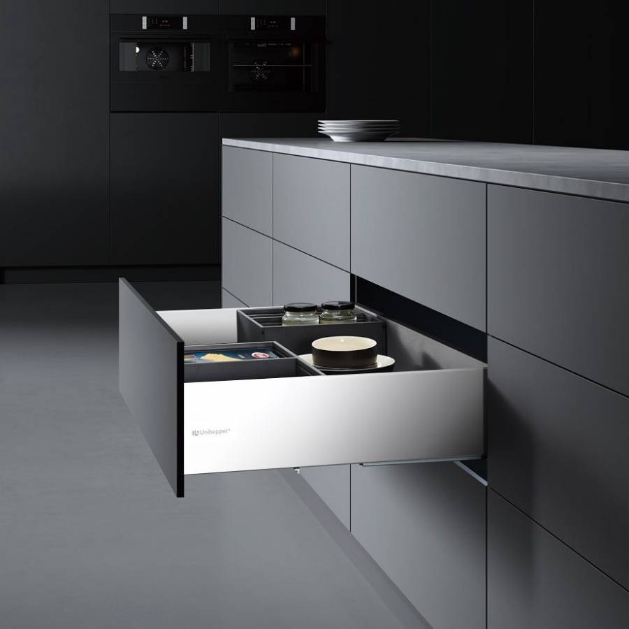 UNIHOPPER MAGIC BOX - это инновационная система выдвижения для стильной мебели с тонкими боковинами, которые позволяют максимально использовать внутренний объем ящика. Современный и лаконичный дизайн соответствует трендам европейской мебели высокого класса.