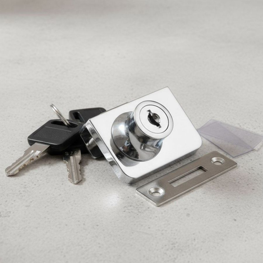 Замок предназначен для запирания стеклянных дверей витрин, шкафов и т.п. Данный замок предназначен для фиксации одной распашной стеклянной двери. Замок мебельный накладной для одной стеклянной двери в комплекте с двумя ключами и ответной планкой. Фиксируется на стеклянной дверке.