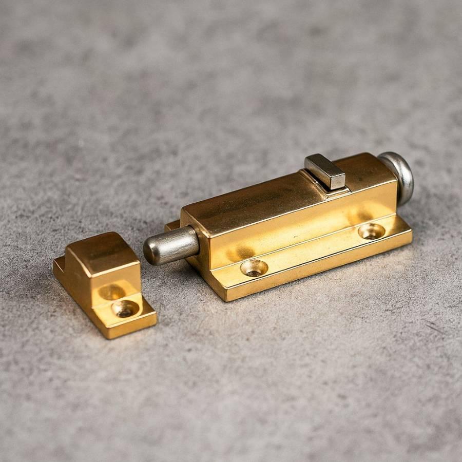 Защелка автомат, золото. Простая накладная установка. Предназначена для установки на двери, окна, форточки. Закрывается нажатием на кнопку защелки (задвижки) сбоку корпуса. Открывается нажатием кнопки на корпусе.